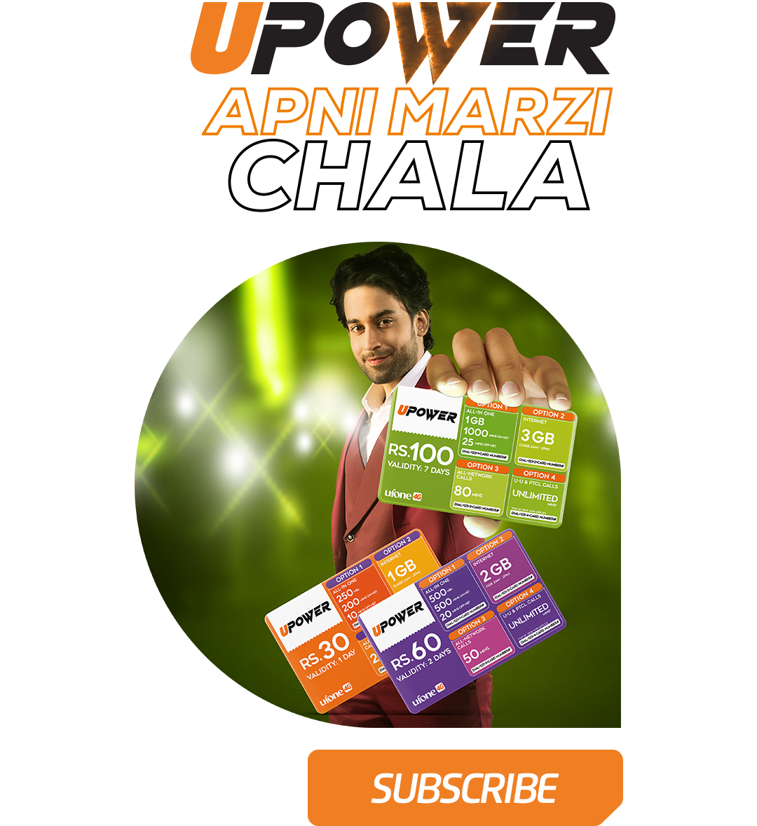 Remember that you can only subscribe to any Upower card via *1234# code. But the main point of notice is its 4 packages scheme. Just dial 1, 2, 3, or 4 in *1234# code according to the subscription of your choice. The picture of 4 packages is always present on the card to tell the subscriber “what type of package they want” through Upower.